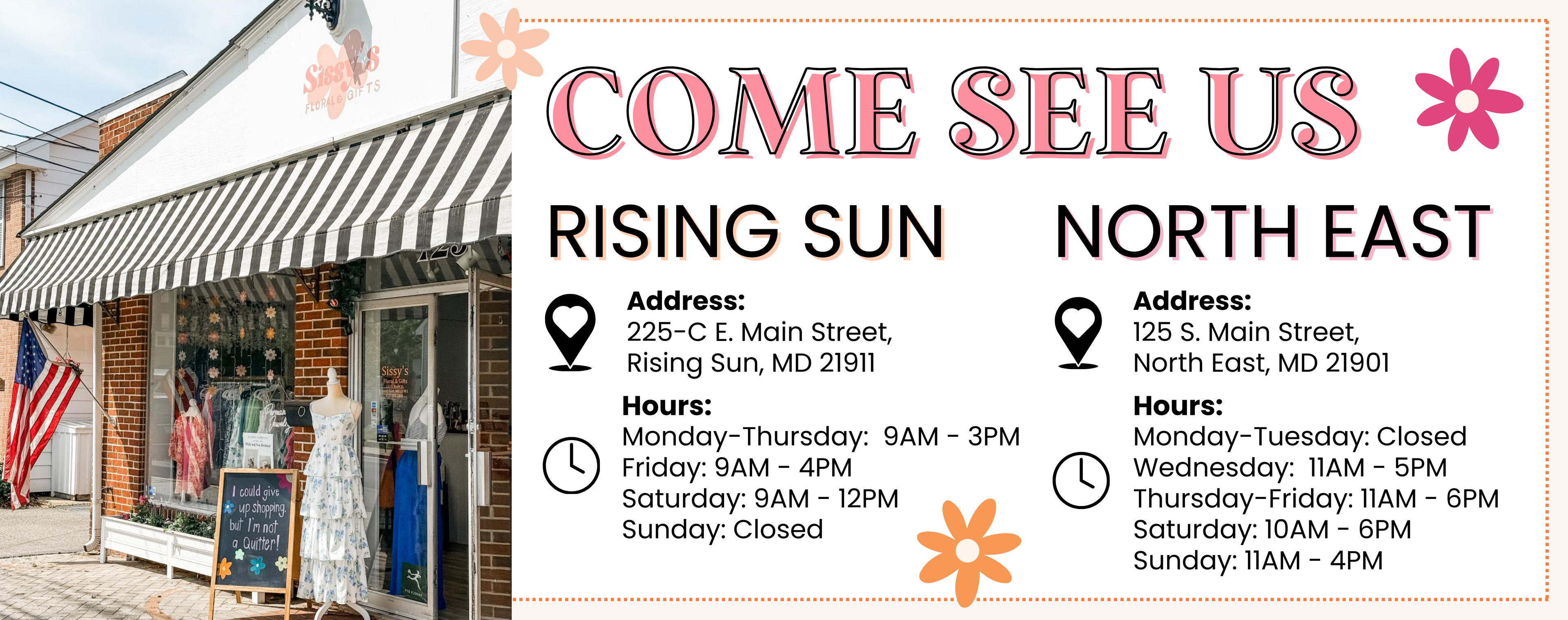 We are a family-owned small business with locations in North East, MD and Rising Sun, MD. We have a passion for all things flowers and fashion- with hand-picked styles and custom arrangements, our goal is to make every one of our customers feel special and appreciated. Shop with us today!