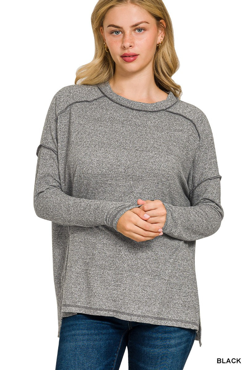 The Black Hacci Hi-Low Top brings a fun twist to your everyday tee with its playful hi-low hem and side slit for easy movement. Featuring exposed seams for an edgy vibe, this soft melange hacci fabric feels cozy while keeping things stylish. Perfect for layering or wearing on its own, it’s a tee that adds personality to any outfit.