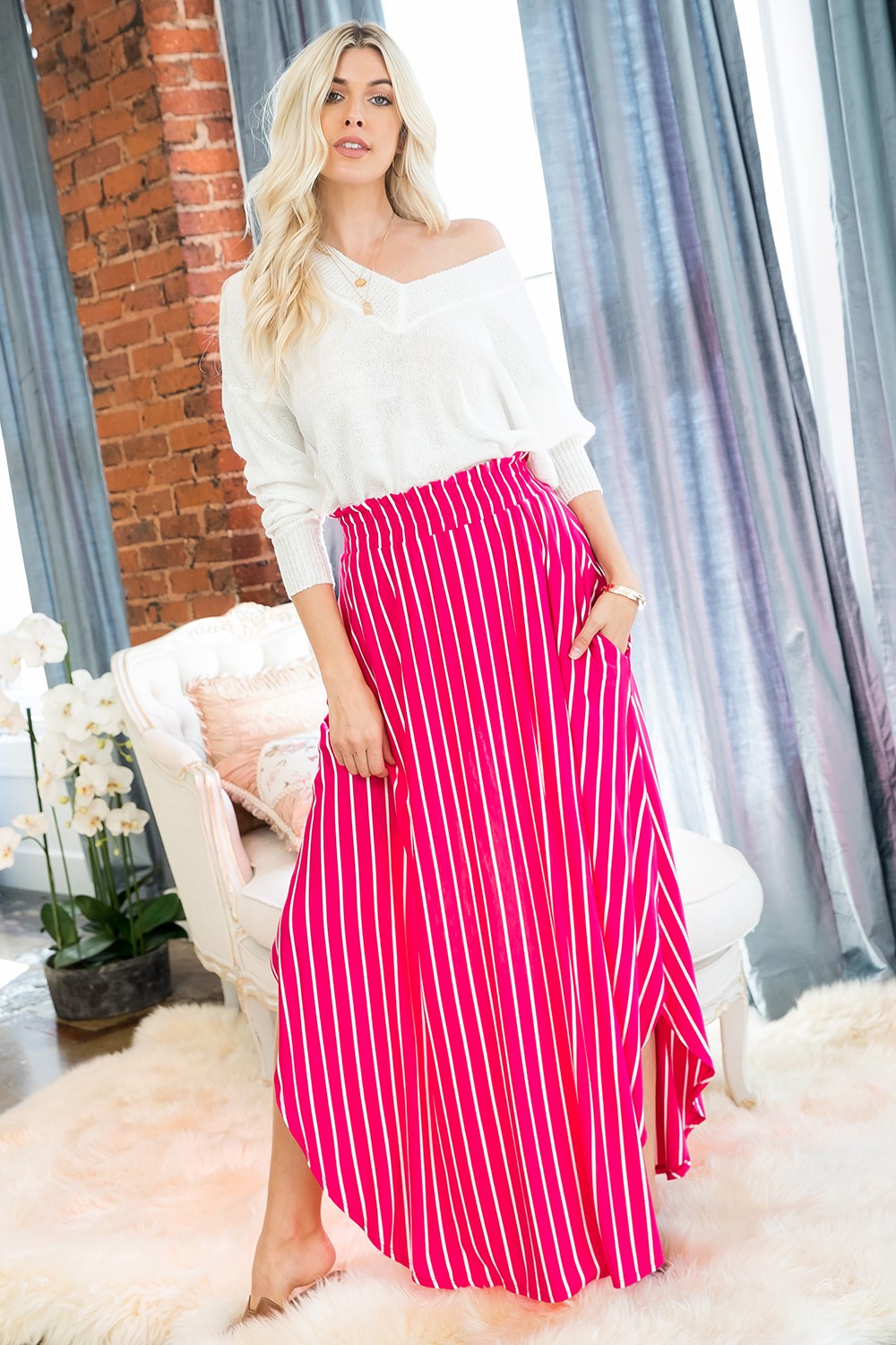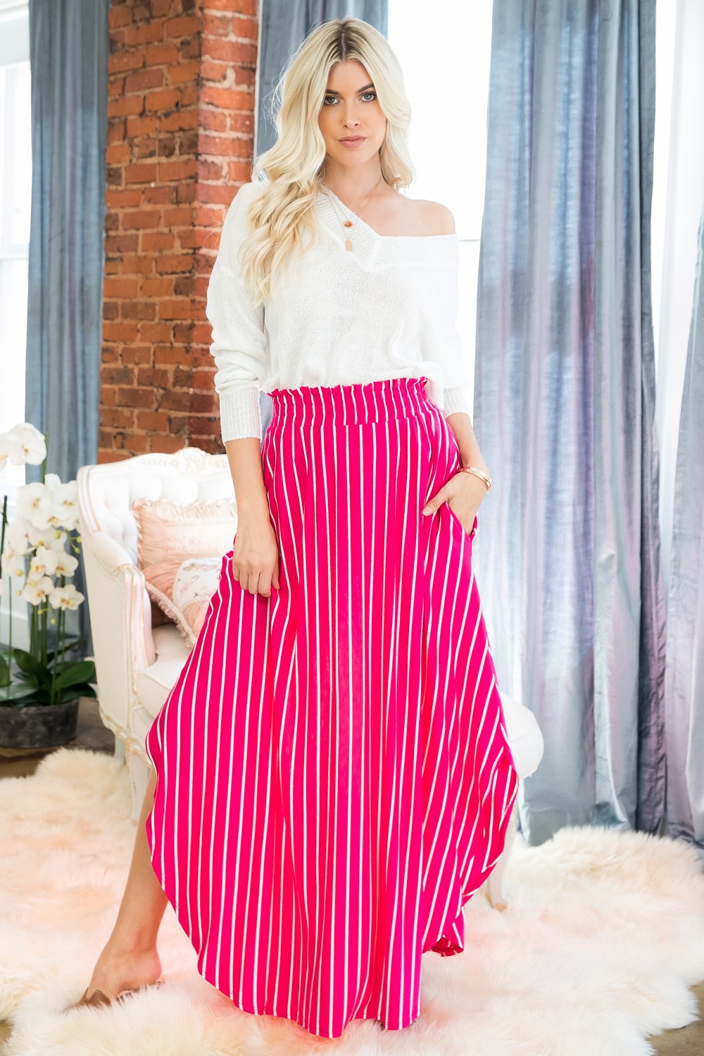 This hot pink maxi skirt with crisp white stripes brings a fun, flirty vibe to any outfit. Its flowing silhouette moves gracefully with you, perfect for sunny days or lively evenings. Pair it with a simple top to let the bold colors shine and enjoy a playful, stylish look that turns heads wherever you go.