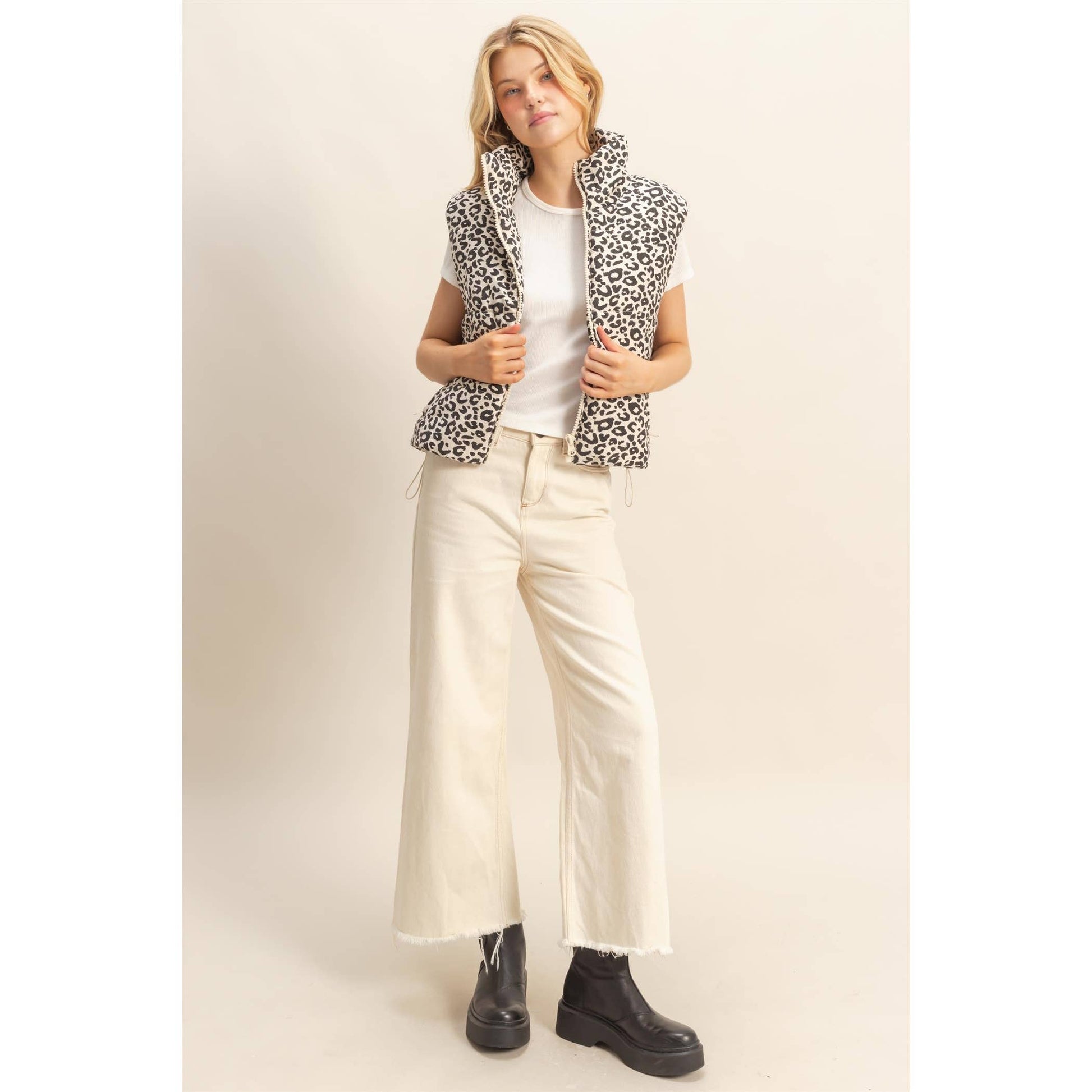 Stay cozy and stylish with this super cute leopard print puffer vest in cream and black. Its playful design and comfy fit make it the perfect layering piece for any casual outing.